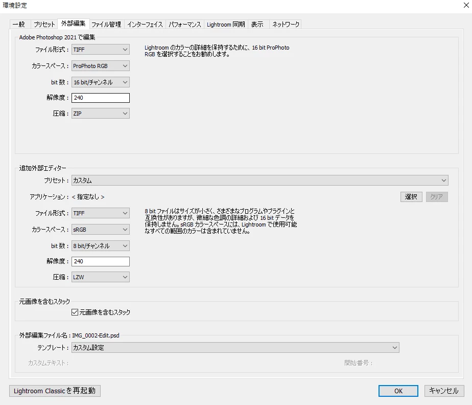ちなみに、ライトルームの環境設定は、添付画像の通りです。