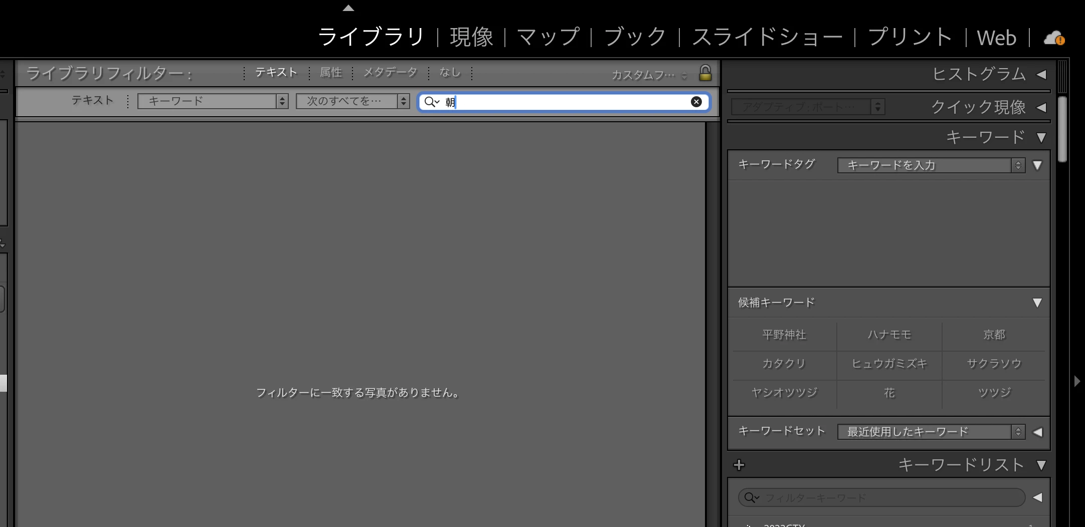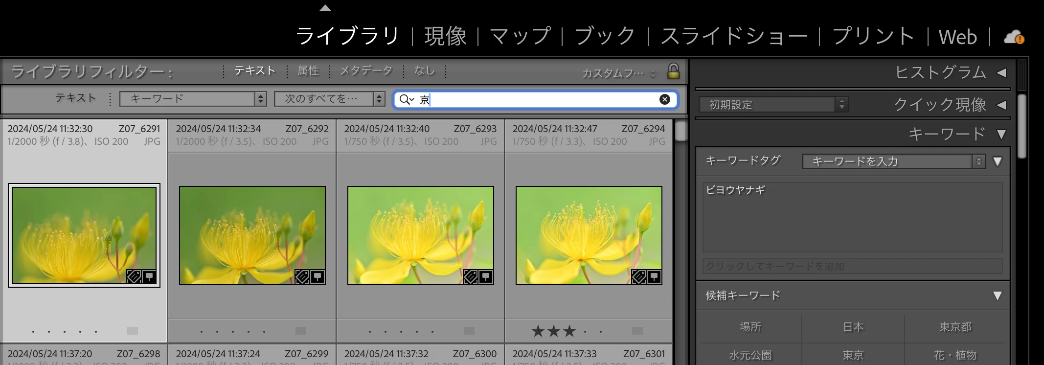ライブラリフィルター:テキストに「京」と入れると、キーワードが設定されている写真がすべて