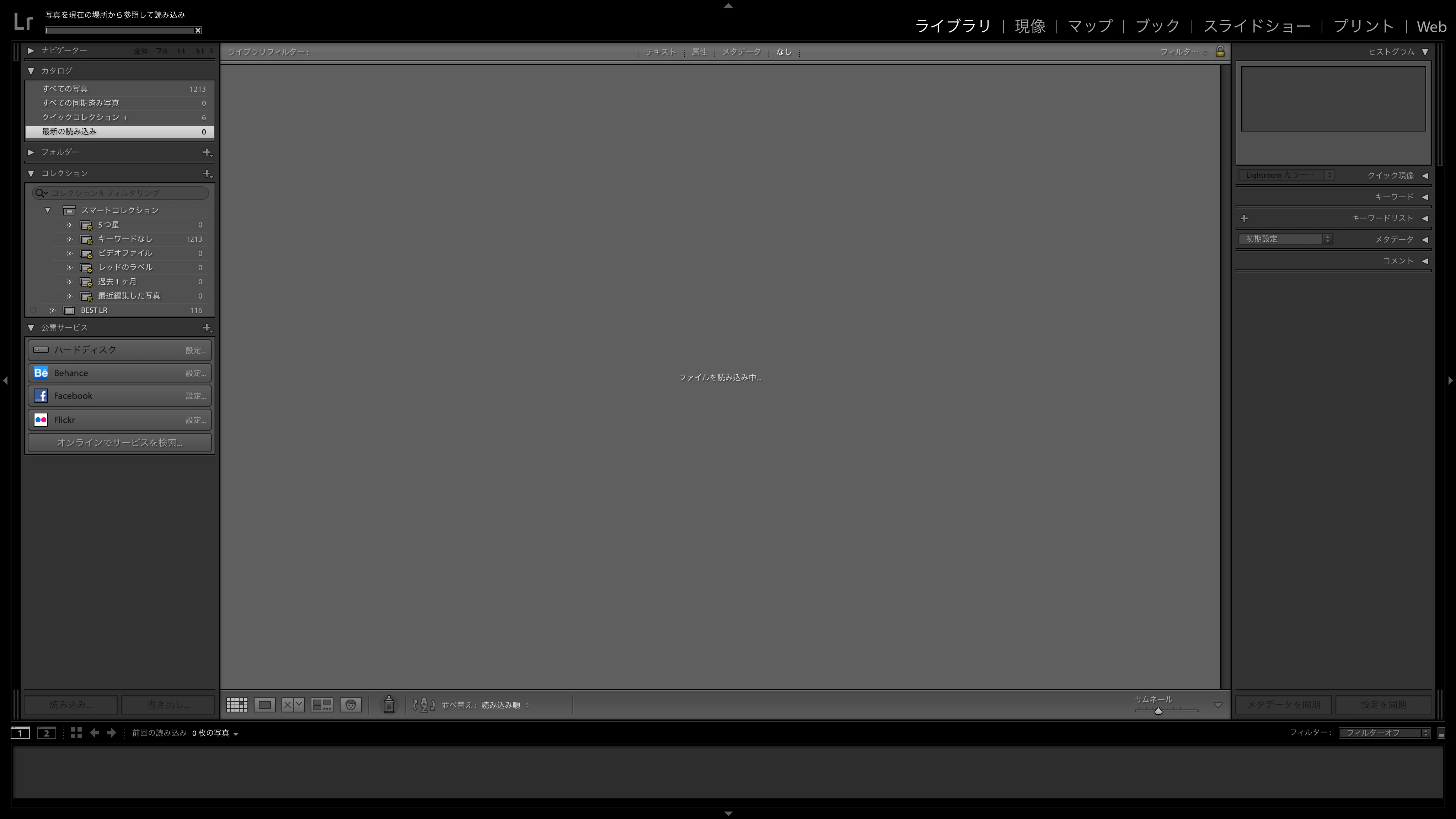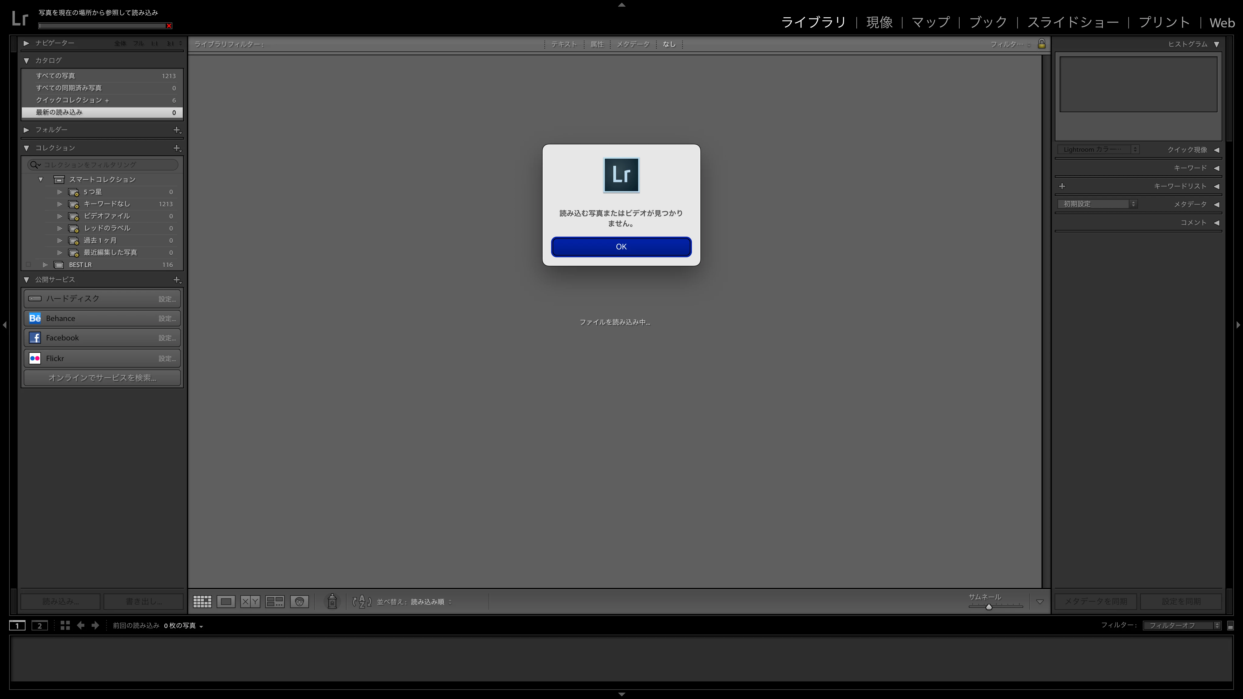 ライブラリ>読み込む>写真を選択し、読み込み を行うと、「写真を現在の場所から参照して読み込み」という文言がステータスバーとともに左上に表示されますが、その後一向に動きません。キャンセルすると、今度は「読み込む写真またはビデオが見つかりません」という文言が出てきて、写真を読み込むことができない状態です。