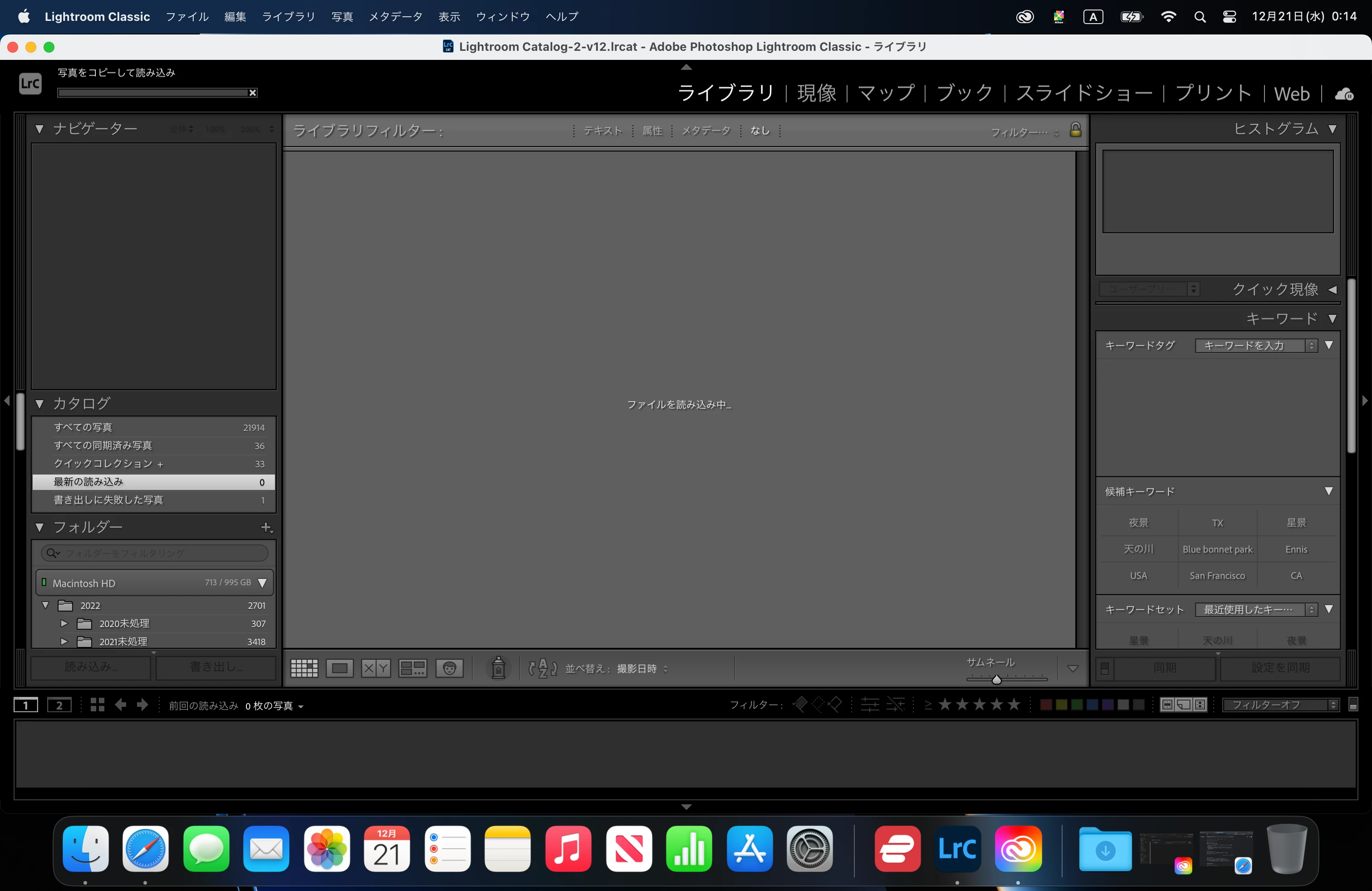 12月頭にMacbookへの買い替えをし写真データやカタログ、プリセットの移行を完了しました。ちょっと記憶が定かでないですが一度新たな読み込みをトライし成功していると思います。現像処理や書き出しなどの処理は問題なくできています。その後、元データの保存先などを一通り修正し(Lightroom上で実施)、この度新たな写真を読み込もうとしたところ、上記の通り全く読み込みが進まない状態となりました。