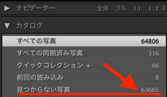Lightroom Classic の写真ファイル、カタログの保存環境を移行したため、多くの写真が「見つからない写真」となってしまいましたが、一つ一つ(実際は保存フォルダで一回ずつ)リンクを更新していますが、ワークスペース左側にある「カタログ」パネルにある「見つからない写真(下図赤線部分)」の件数が一向に減りません。件数が減らないと同時に再リンクした写真も相変わらずこの「見つからない写真」に表示されてしまいます。