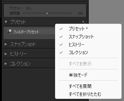 プリセットが表示されなくなり、右クリックをしても「すべてを表示」はクリックできません。(画像添付1枚目)