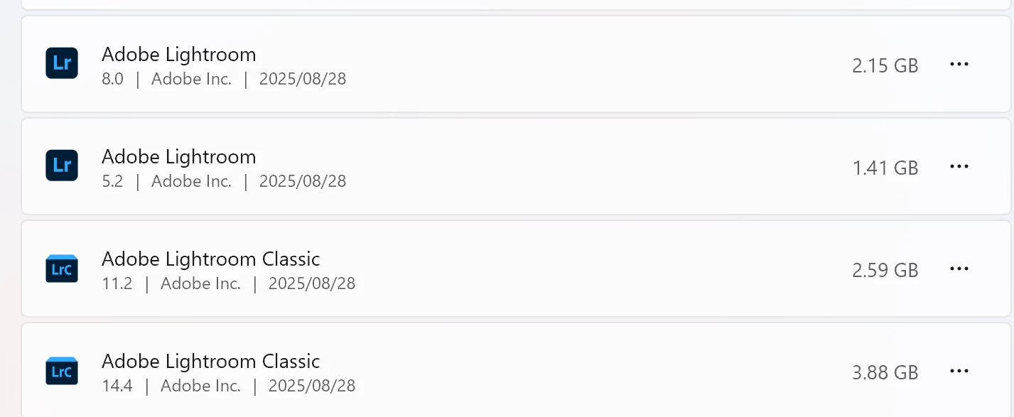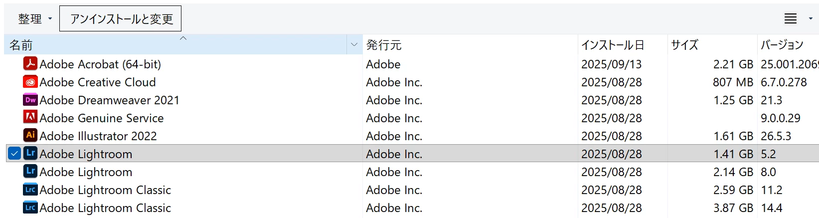Lightroom Classic (およびLightroomCC)は1つずつしかインストールしていないですが、Windowsコントロールパネルの「アプリ」でみると、2つずつ入っています。サイズもバラバラです。