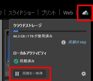 1.Lightroom Classic を起動し、画面右上の雲マークを選択して「同期を一時提示」を選択します。