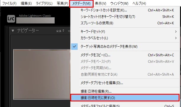 6.画面上部メニューから「メタデータ>撮影日時を元に戻す」を選択します。