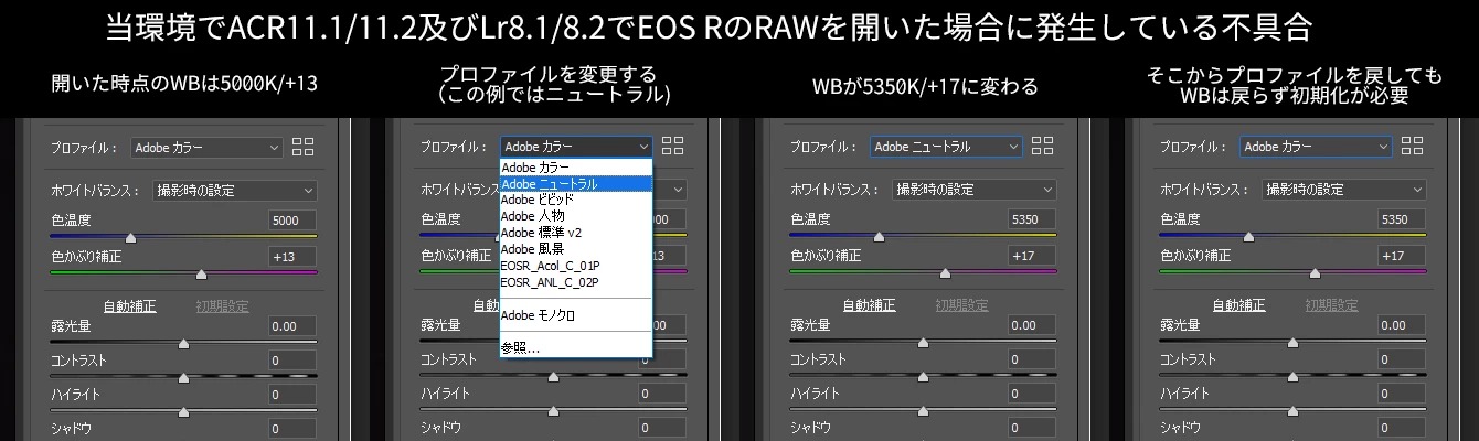 なお、発生している現象は以下の画像のようなもので、プロファイルを変更しただけでWBが勝手に変更されるというものです。