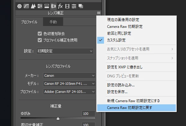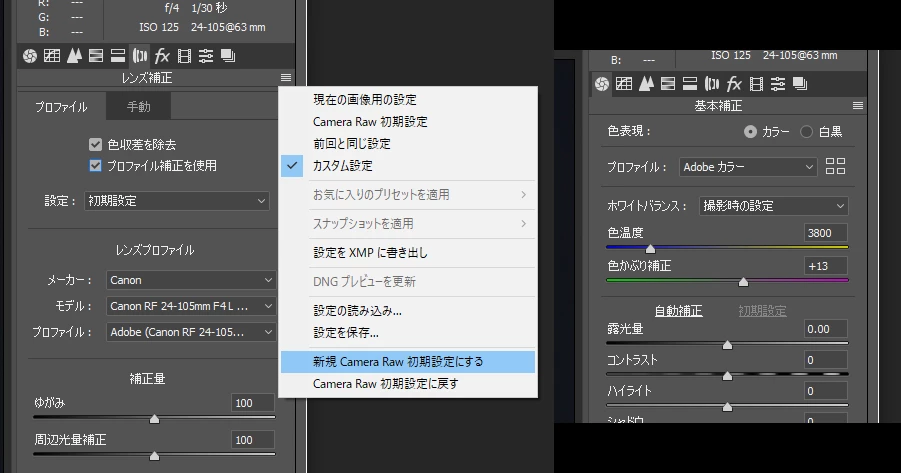 色収差とプロファイル補正をonにした状態で「新規 Camera Raw 初期設定にする」を使用していました。