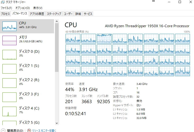 しかし、CPUが40%前後、メモリが40%前後、GPUは10%前後しか機能していない様です。
