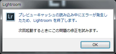 ・プレビューキャッシュの読み込み中にエラーが発生したため、Lightroomを終了します。次回起動するときにこの問題の修正を試みます。