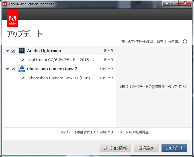 今回のLightroomのメジャーアップデートから、Lightroom本体の【ヘルプメニュー:アップデート...】から進むとAdobe Application Managerが起動します。