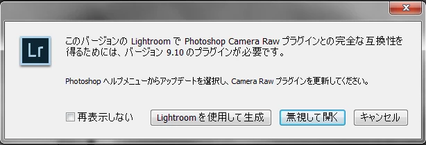 Lightroom CC2015.10から「他のツールで編集」でPhotoshop CC2017を選んで画像を渡すと、PhotoshopのCamera RAWが9.10にアップデートされていていも、添付画像の様なエラーメッセージが表示されます。