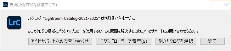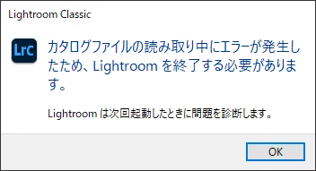 新規カタログを作成して、写真を新規カタログに読み込ませていますが、200枚程度の写真を読み込ませて使っていると、下のようなエラーが表示されてしまいます。