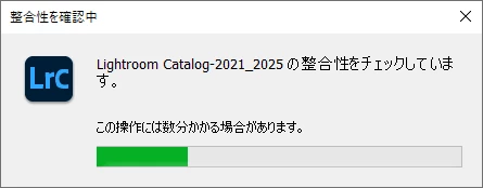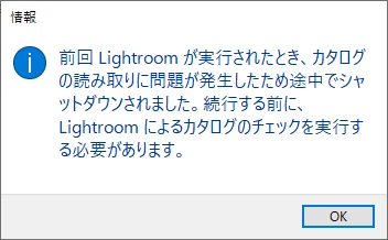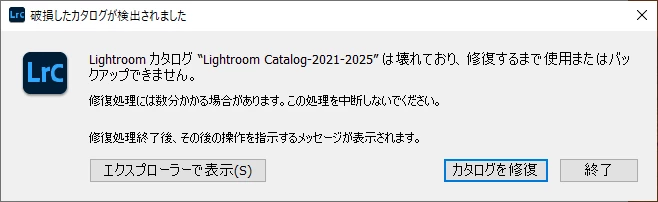Lightroom classicをカタログファイルから起動させようとすると、カタログのチェックの実行をするダイアログが表示されて、その後カタログが壊れていると修復のメニューが表示されますが、