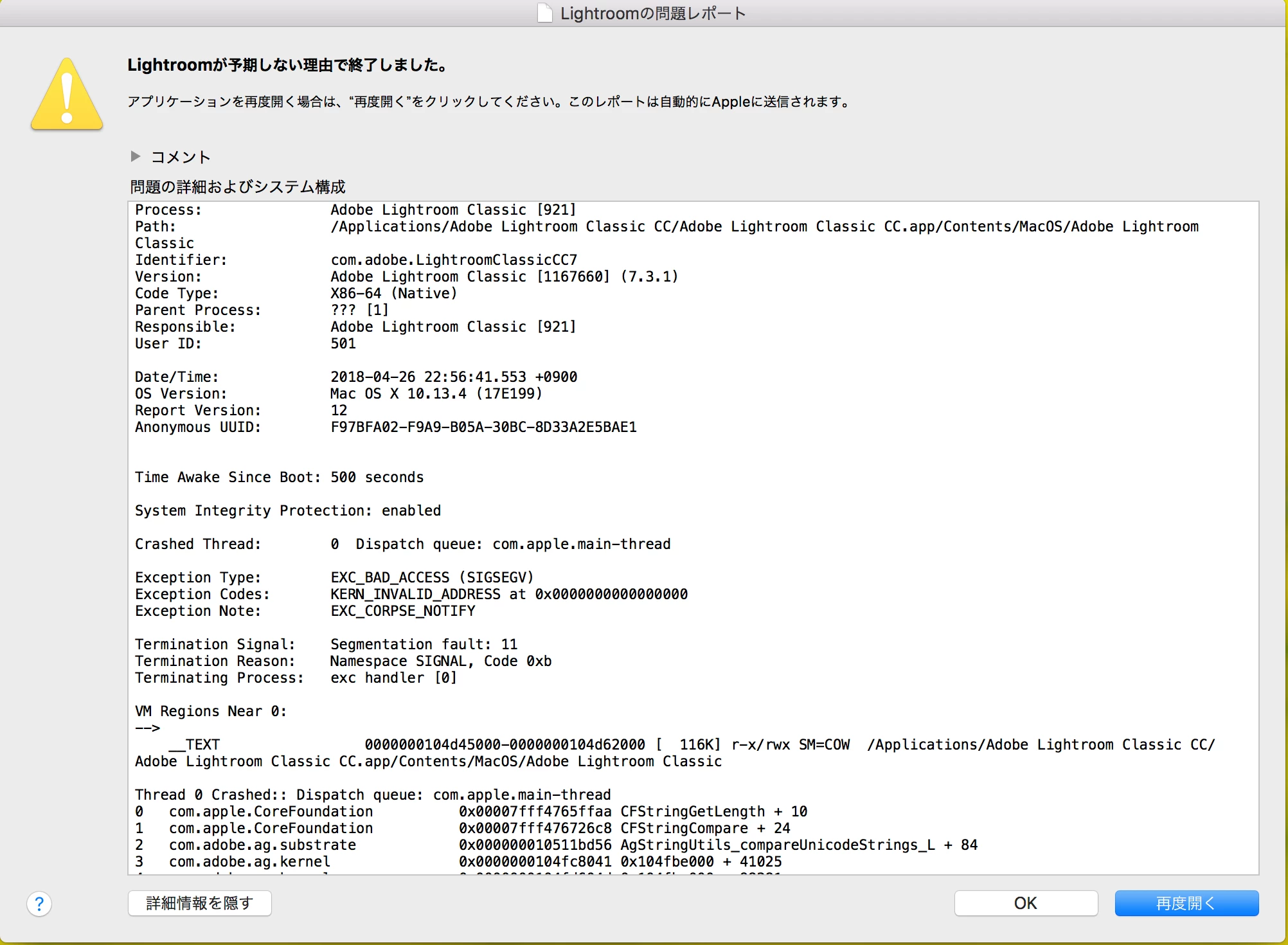 lightroom classic ccを起動するとエラーが出て直ぐに閉じられてしまいます。何が問題でしょうか?問題の詳細及びシステムの構成のところで長いスクリプトが出てきますが、、