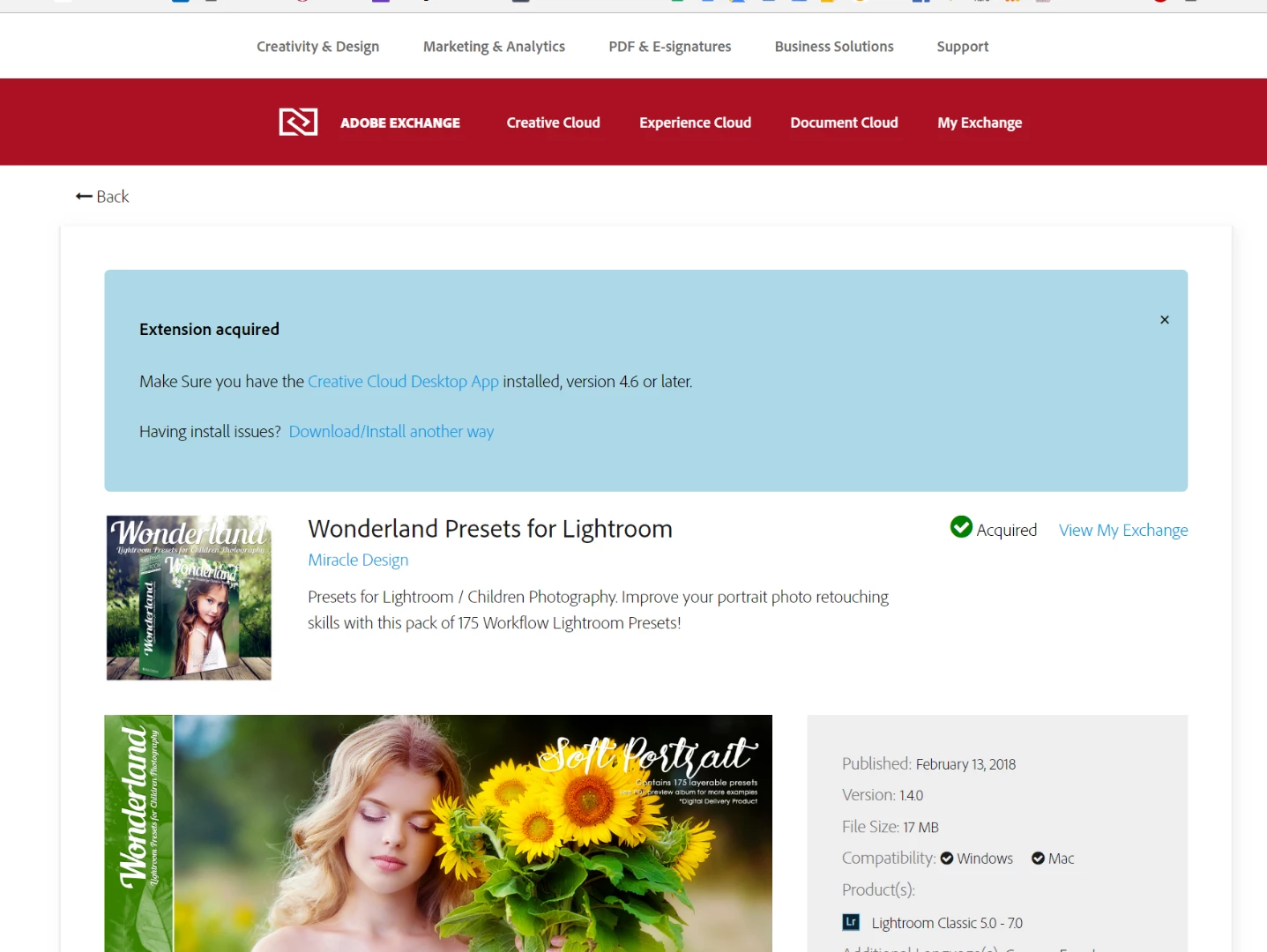 Adobe Exchangeからエクステンションやプリセットをインストールする場合、Creative Cloudを同期させておく必要があります。今一度、Adobe Creative Cloudデスクトップアプリケーションの同期設定の状態をご確認ください。