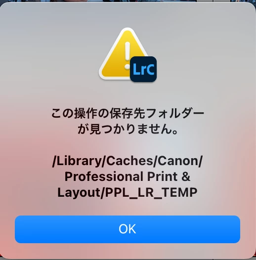 寿寿274342999bycParticipantForum|Forum|1 year agoAugust 20, 2024質問Professional Print & Layoutに写真を送ろうとすると、「この操作の保存先フォルダが 見つかりません」とのエラーrForum|Forum|1 year agoAugust 20, 2024返信数 1.270 ビューLightroomからCanonのProfessional Print & Layoutに写真を送ろうとすると、「この操作の保存先フォルダが 見つかりません」とのエラーメッセージが出ます。Lightroom Classicをアップデートしてからこの症状が出たように思います。 [投稿をLightroom Classicフォーラムに移動させていただきました:モデレータ]Mac問題またはエラー