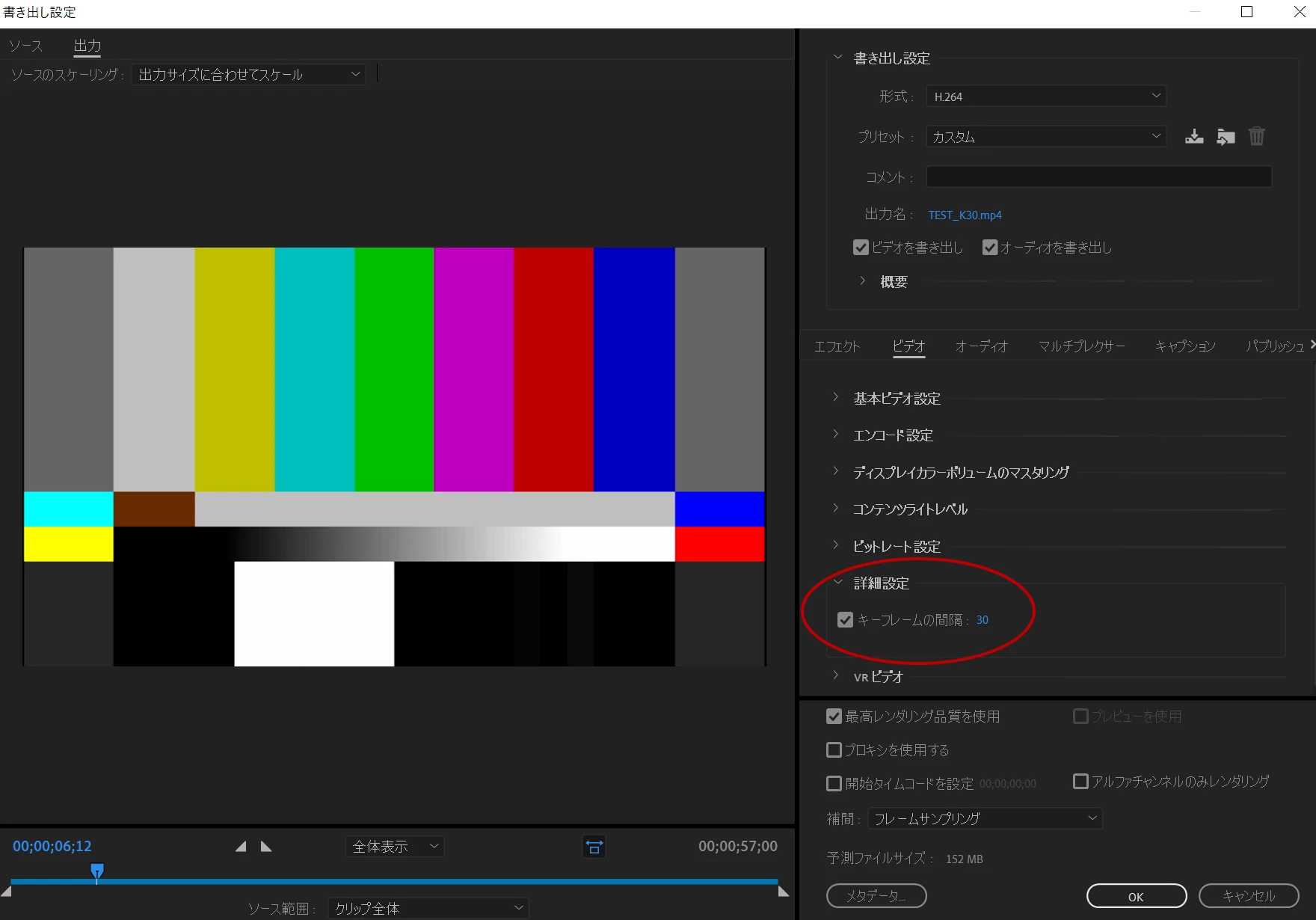 この場合、書き出し設定のビデオの詳細設定のキーフレームの間隔を