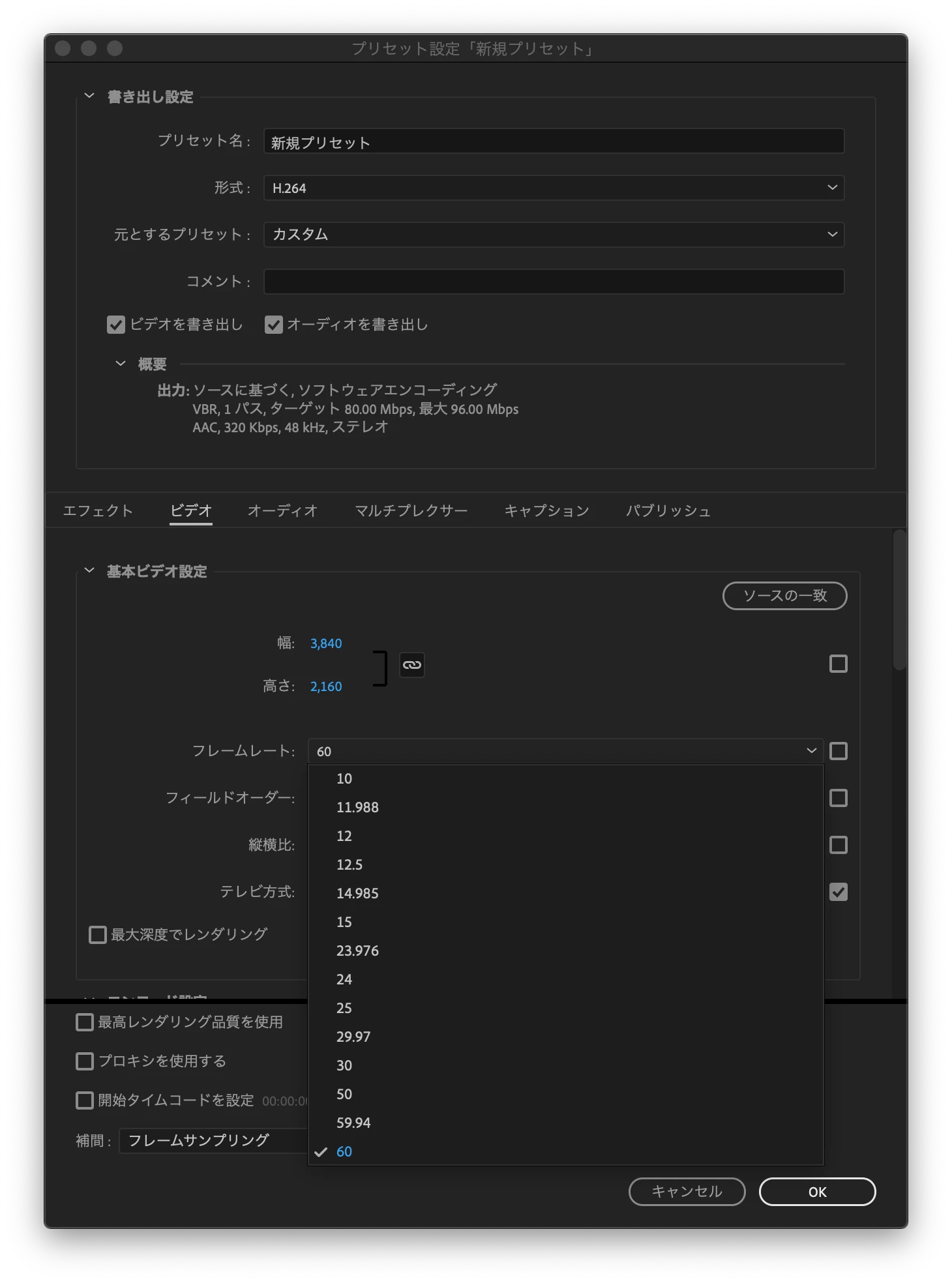 H.264形式でフレームレートを69.94fpsで書き出したいです。