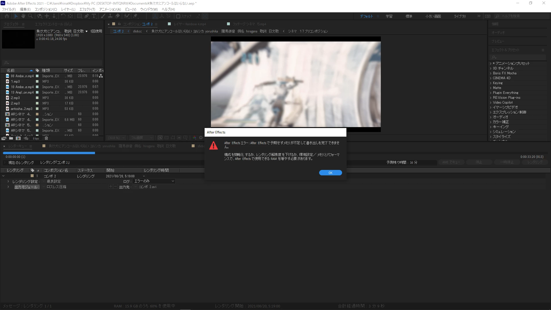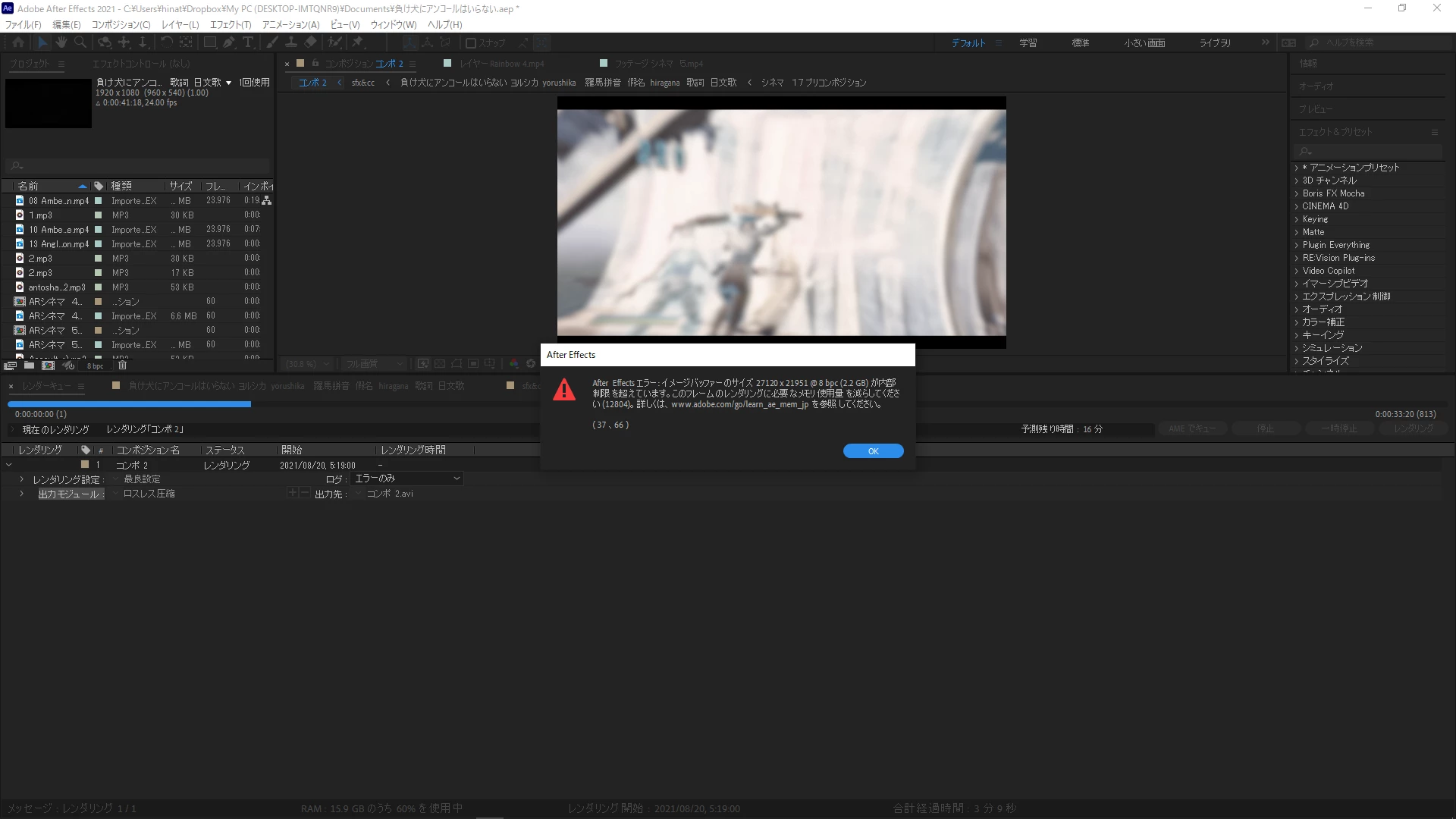 更にAeのレンダーキューからAVIで出力してみても2枚の写真エラー表記が出てしまって直し方が全く分かりません。