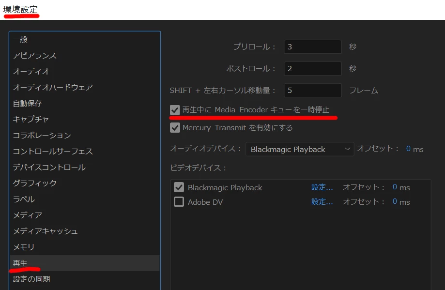 Premiere Pro側の環境設定の「再生」で変更可能です。