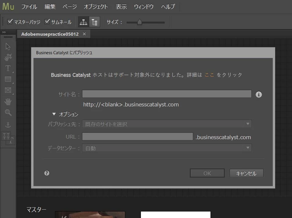 Adobe Muse で初めてBusiness Catalystでパブリッシュしようとしていますが、「Business Catalystにパブリッシュ」のポップアップのサイト名/URL入力欄がグレーの状態で入力できません。どなたか、初めてパブリッシュする際にサイト名が入力できないトラブルの解決方法ご存知の方いらっしゃいませんか…
