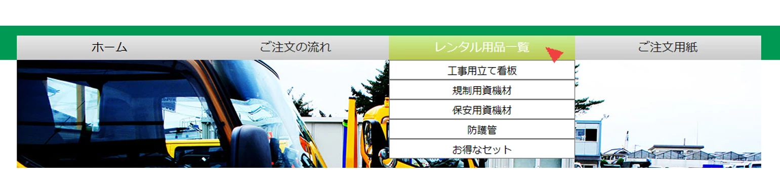 ”レンタル用品一覧”部分はメニュー表示だけでページはなく、子ページの"工事用~"~”お得なセット”部分のみ各ページへ