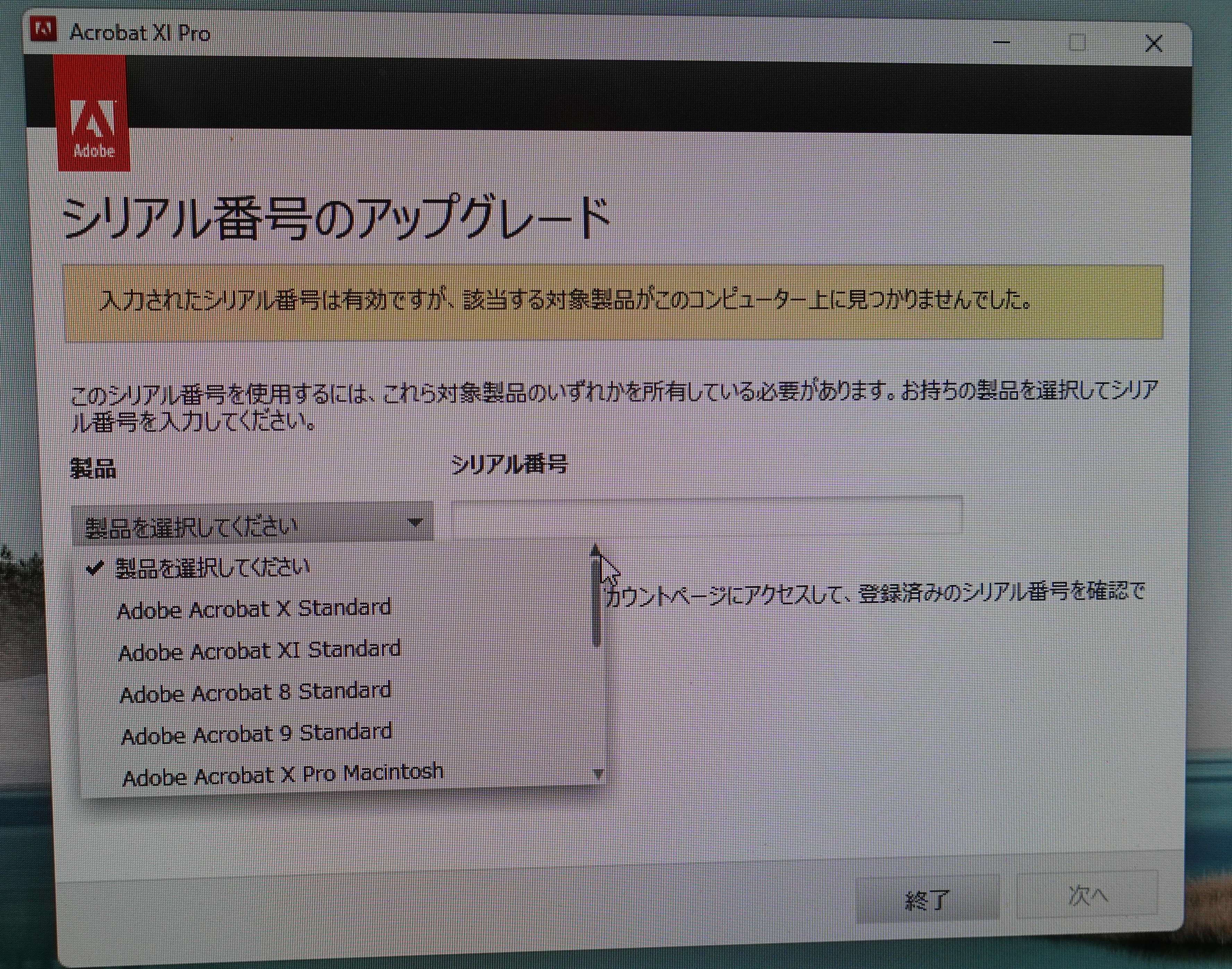 新しくWin11対応PCを購入し、これにAdobe AcrobatⅪ Proをディスクからインストールしました。インストールが完了したのでシリアル番号を入れて認証を受けようとしたら「入力されたシリアル番号は有効ですが、該当する対象製品がこのこのコンピュータ上に見つかりませんでした。」と表示が出て認証されません。