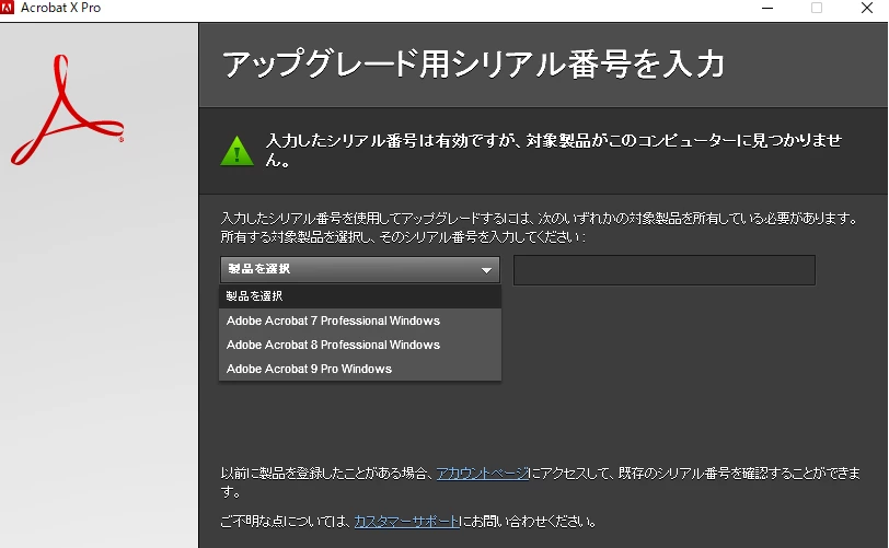 シリアル番号を入力したところ、添付のスクリーンショットにあるダイアログが表示されました。「acrobat 7、8、9のいずれかを所有している必要がある」とありますが、acrobat X proを購入して所持していればこちら単体でインストールを進められるはずです。
