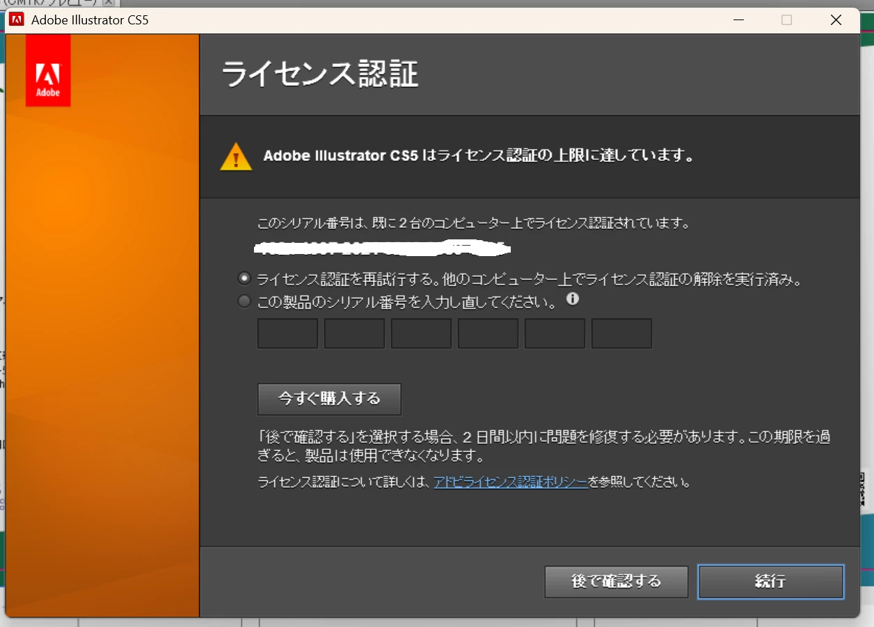 五五月271597042j3dParticipantForum|Forum|6 months agoJuly 31, 2025質問Adobe Illustrateor CS5のライセンス認証が上限に達しているとメッセージが表示されます。Forum|Forum|6 months agoJuly 31, 2025返信数 2.140 ビューAdobe Illustrateor CS5のライセンス認証が上限に達しているとメッセージが表示されます。上限は2台までですが、一度アプリが消えて再インストールしたところ他の1台と合わせて3台目と認識されたようです。同じPCを利用しているので実質2台目の利用なのですが、このままだと利用できなくなります。解決方法はありますか?