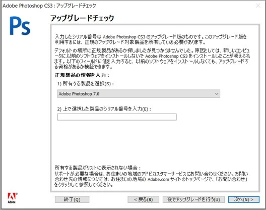 良良一芳83318185ParticipantForum|Forum|3 years agoAugust 14, 2022質問CS3アップグレード版のインストールが出来ないForum|Forum|3 years agoAugust 14, 2022返信数 2.381 ビュー昔のパソコンにバンドリングされていたPhotoShop(エレメント2.0だと思う)を、CS3、CS5のアップグレード版を段階的に購入して使用していましたが、新しいパソコンで、CS5でいいから使いたいなと思い、CS3からダウンロードしたところ、セットアップ画面でアップグレードチェックの際に、所有する製品選択のところに、バンドリングされていたバージョン(エレメント2.0)の選択肢がないため、シリアル番号の認証が出来ないでいます。どのようにすれば、バンドリングされていた製品の入力が出来、インストールが成功するでしょうか。ご教授ください。ダウンロードとインストール
