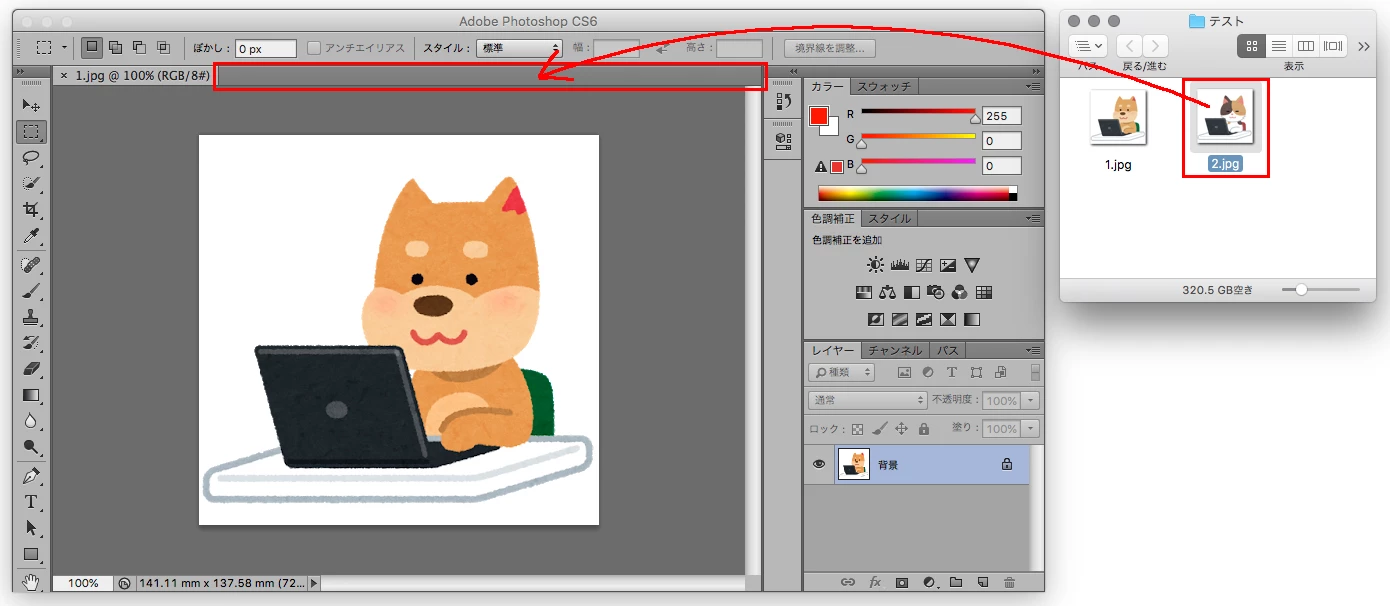 以前、CS2を使用しておりJPEG画像等をフォトショにドラッグ&ドロップすると自動で別タブで閲覧できたのですが、CS6だと開いているページに直接貼り付けられてしまいます。以前のような仕様にするためにはどうすればよろしいでしょうか?