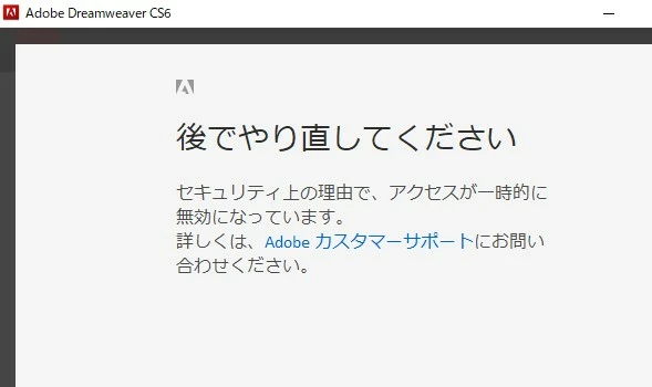 DREAMWEVERCS6 永久ライセンス版のシリアルナンバーを打ち込んだ後に、ADBEへのログインができません。『後でやり直してください セキュリティ上の理由で、アクセスが一時的に無効になっています。 詳しくは、Adobe カスタマーサポートにお問い合わせください。』という表示が出ます。どのように解決したらよいのかご教授お願いいたします。※ADBEのアカウントには問題なくログインができますので、パスワードエラーとかではありません。