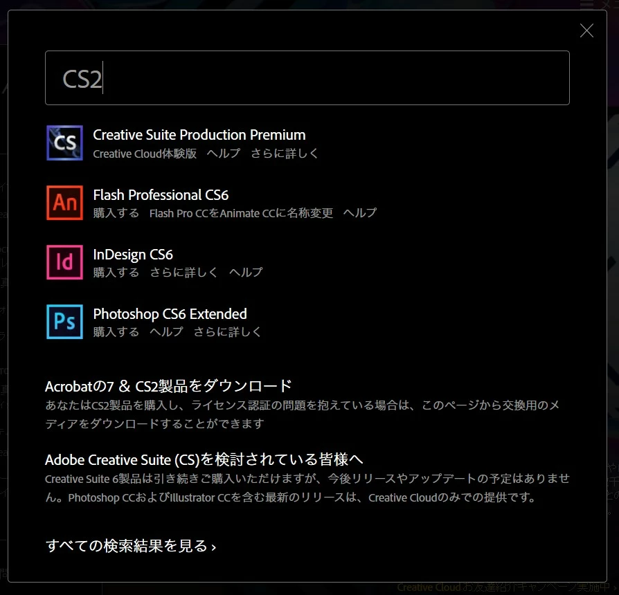 AdobeのWebサイトのトップページで「CS2」で検索を行うと関連ページが表示されます。