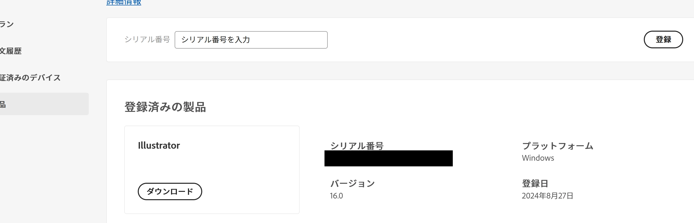 Adobe IDのアカウントにて製品登録状況を確認すると、
