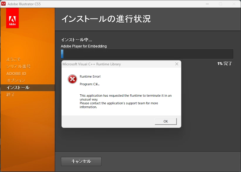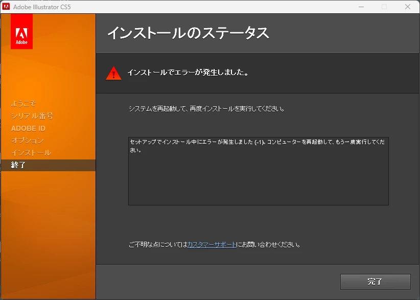 IllustratorCS5 エラーが発生してインストールできない