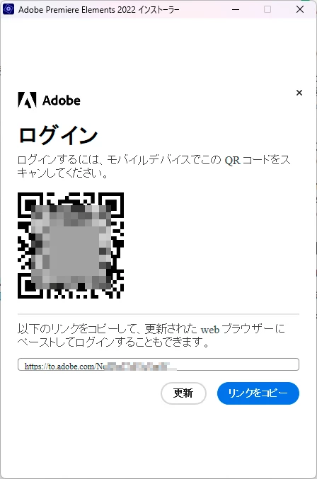 PCでpremire elements 2022をインストールしていますがログイン時にQRコードが表示され、スマホでそれを読み込むとadobeのページが表示されます。インストールがそこで終わってしまい