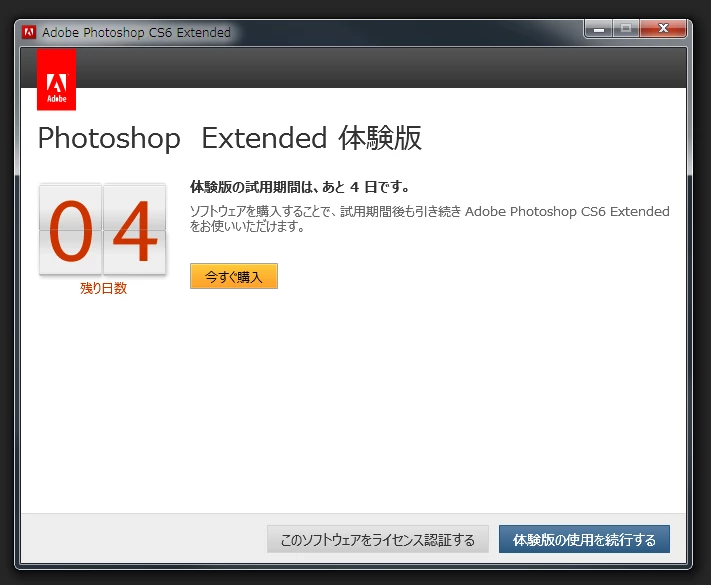 フォトショップCS6を購入し10年以上が経過した最近、突然体験版終了までxx日という