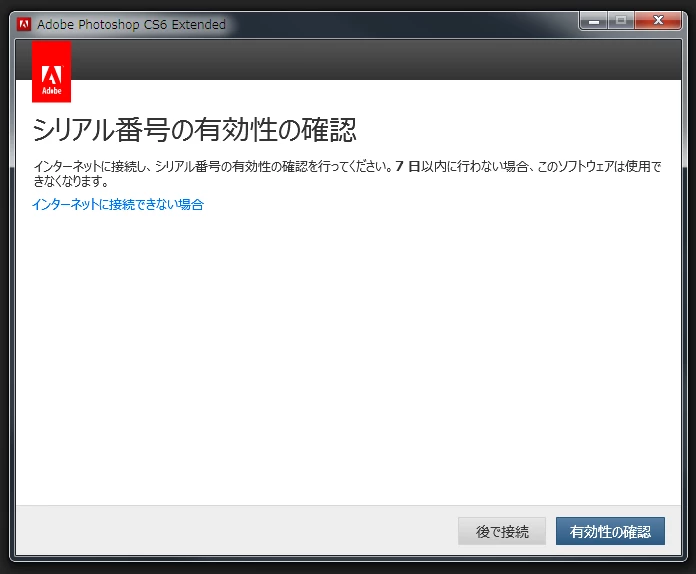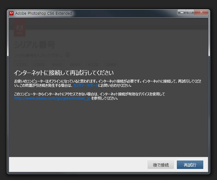 Photoshop CS6 オフラインによるライセンス認証でシリアル番号 xxx は無効です。サポートにお問い合わせいただくか、別のシリアル番号を入力してくだ