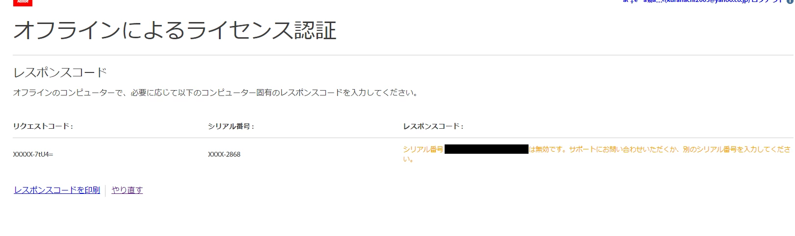 シリアル番号 xxx は無効です。サポートにお問い合わせいただくか、別のシリアル番号を入力してください。