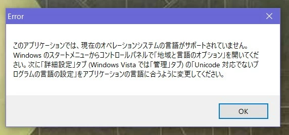 "このアプリケーションでは、現在のオペレーションシステムの言語がサポートされていません。Windowsのスタートメニューからコントロールパネルで「地域と言語のオプション」を開いてください。次に「詳細設定」タブの「Unicode対応でないプログラムの言語の設定」をアプリケーションの言語に合うように変更してください。"