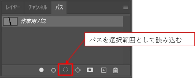 ②「パス」パネルで「パスを選択範囲として読み込む」アイコンをクリックします。