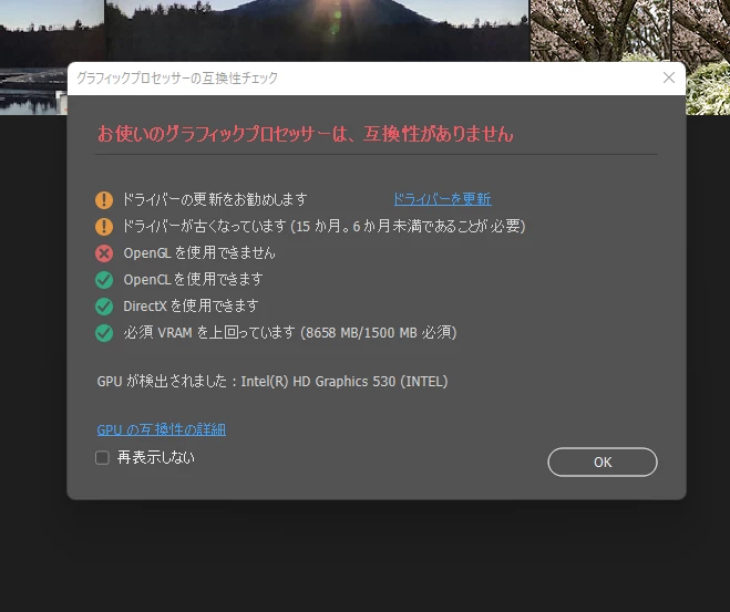 幹幹也24997743rgq1ParticipantForum|Forum|3 years agoJune 24, 2022Questionアップデート後グラフィックドライバーに問題ありと出て起動しませんForum|Forum|3 years agoJune 24, 20221 reply1343 viewsPhotoshopをアップデート後「お使いのグラフィックプロセッサーは、互換性がありません」と出て、互換性チェックではOpenGLが使用できませんと表示され起動しません。今までは問題なく動作していました。driverは intel HD Graphics 530で、指示によりdriverの更新をしましたが解決しません。解決方法をご教示下さい。macOSWindows