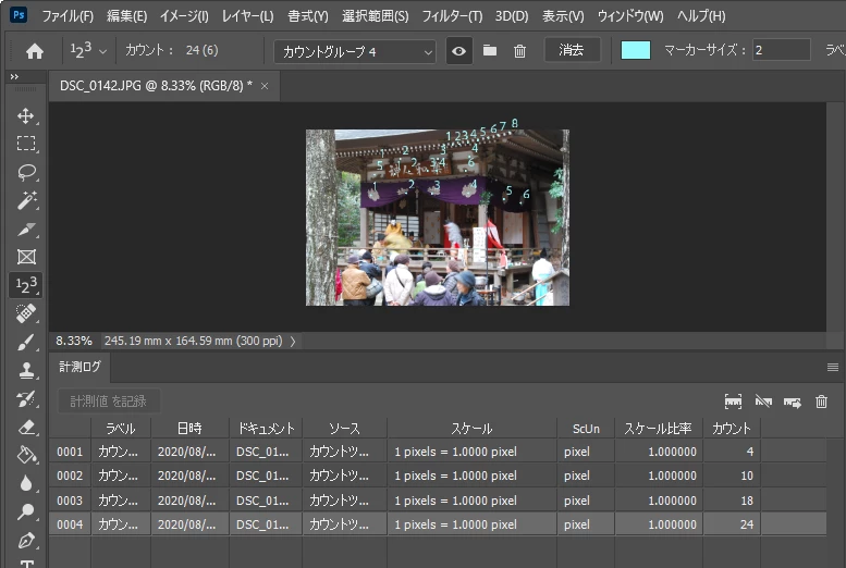 Photoshop Elementsには、「ものさしツール」や「計測ログ」パネルはありませんので、残念ながらカウントツールは使えません。