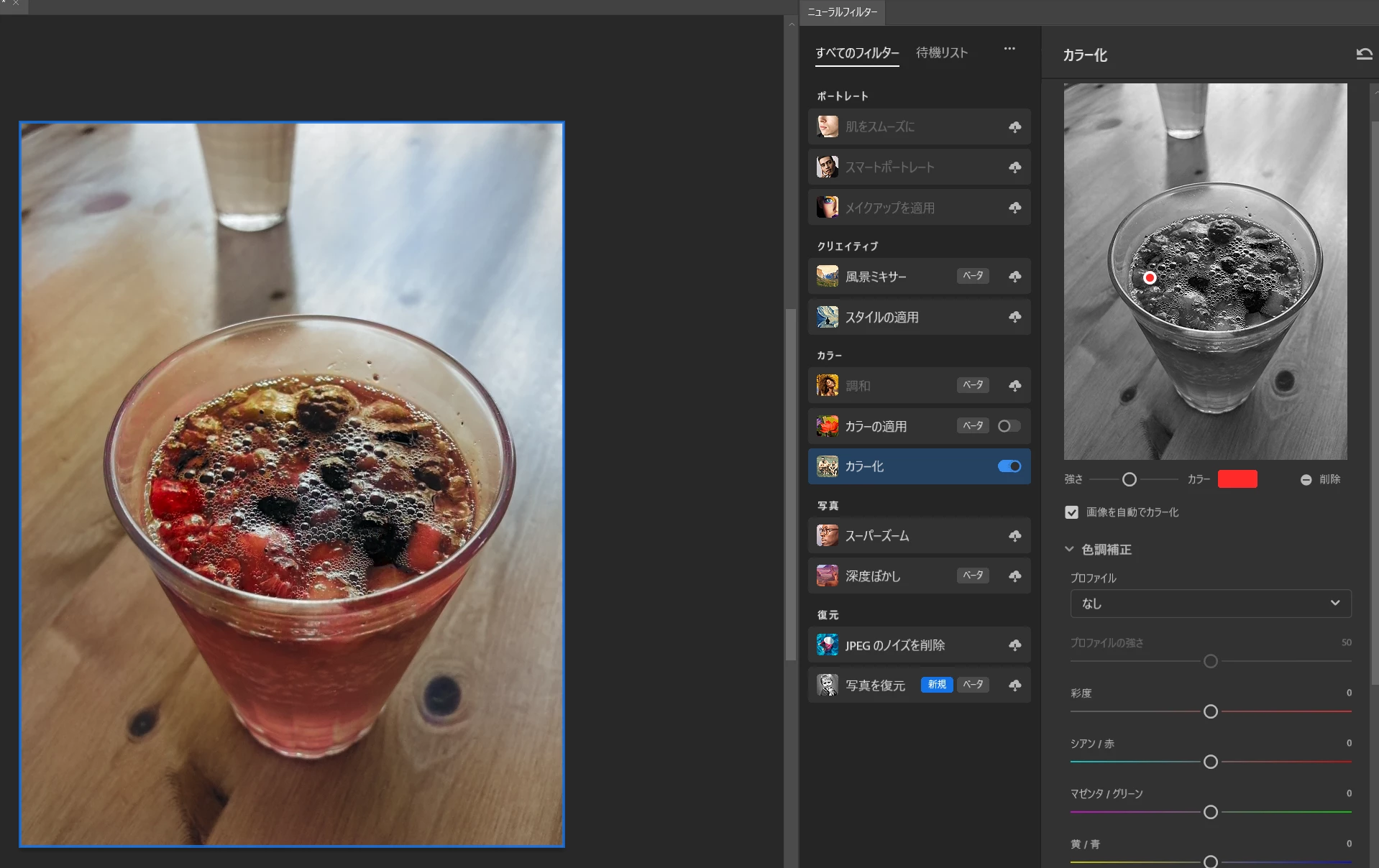 ニューラルフィルター内である程度コントロールするには以下ように「画像を手動でカラー化」の画像サムネイル上の任意の点をクリックします。カラーパネルが開くので適切なカラーをピックアップしてその部分の色指定とします。