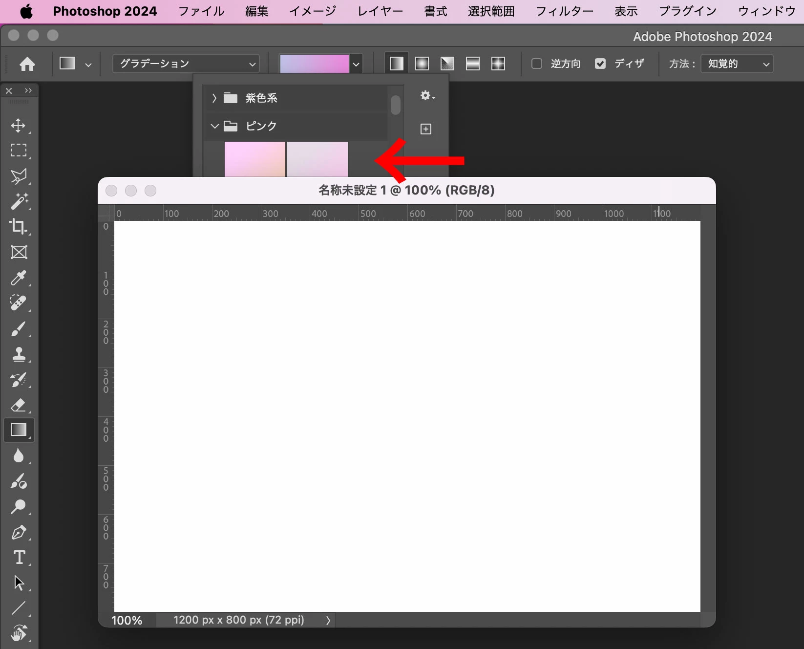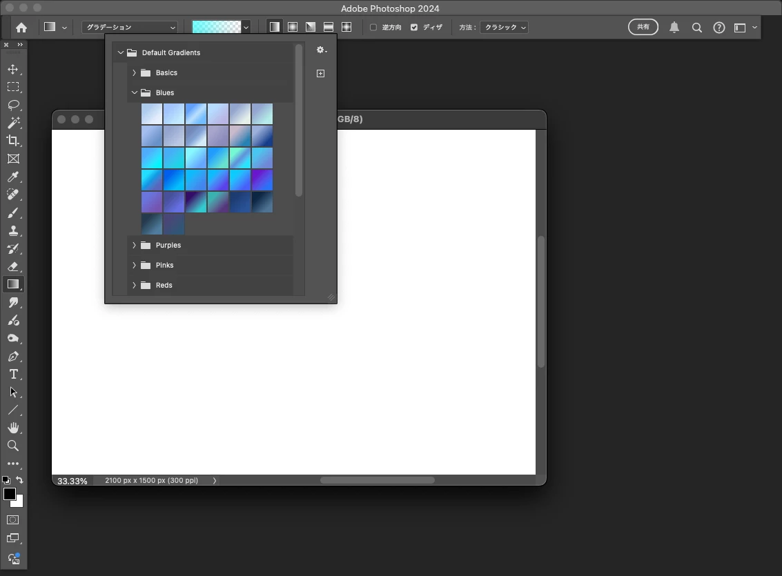 グラデーションツールを選択したときにオプションバーの色候補を手前に表示したいです