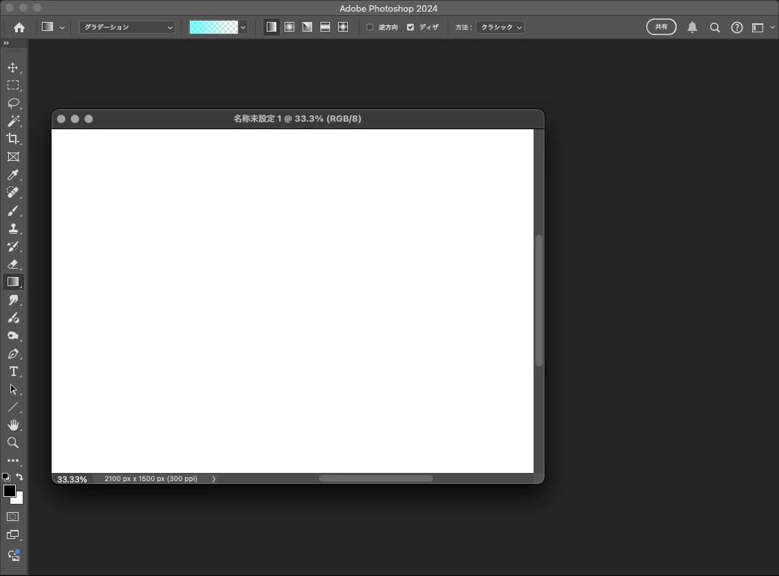 下図はツールバーとオプションバーがアプリケーションウインドウに吸着している場合です。細かな違いですがわかりますか。(ツールバーが吸着しているとツールのポップアップが同じようにドキュメントの背面に行きます。)
