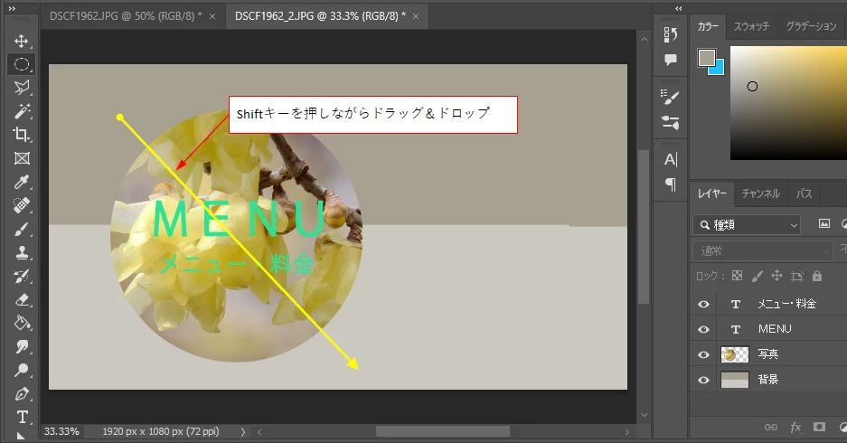 Ten Aさんからの回答にあるように、写真位置を調整できるようにレイヤーマスクをおすすめします。