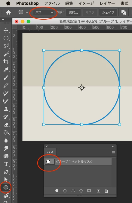 楕円形ツールでツールモードが「パス」になっているのを確認してから作成。