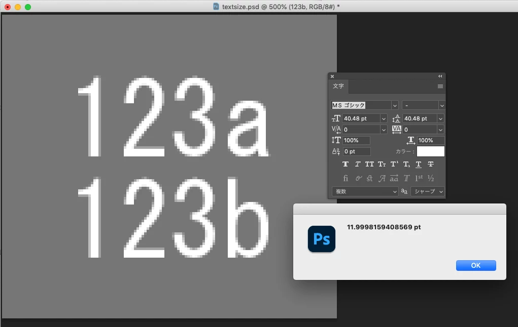 「123a」は新規ドキュメントを作成し、テキストを新規で作成したものです。