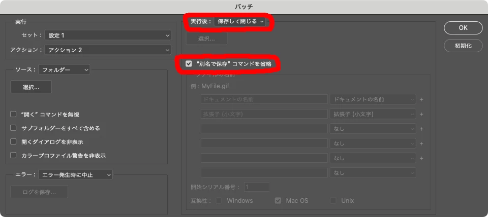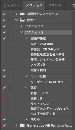 アクションをつくりたいのですが、サイズ変更はできますが、jpegへ揃えられません。